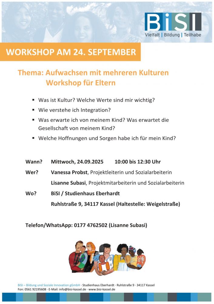 In Workshops, die in Elterngruppen anboten werden, findet ein Austausch über das Aufwachsen der Kinder mit mehreren Kulturen und über Fragen zu Erziehung, Integration und Werten statt. Dazu gehören auch Gespräche und praktische Tipps zum Beispiel zur Vereinbarkeit von Beruf und Familie, zu Familien- und Sozialleistungen sowie zur Familienplanung.