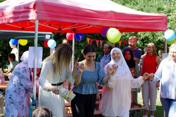 Fröhliche Gesichter bei strahlendem Sonnenschein: Am Freitag, 4. Juli, kamen viele unserer Kursteilnehmenden mit ihren Familien, dazu Ehrenamtliche, Mitarbeitende und Ehemalige, zum Sommerfest. Insgesamt über 100 Menschen feierten zusammen im schön dekorierten Garten einer Lehrkraft. Es wurde gegrillt und ein internationales Büfett aus mitgebrachten Speisen angeboten.